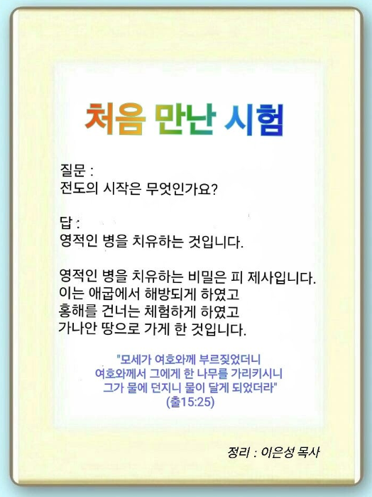 모든 사람에게는 숨은 영적인 병이 있습니다. 이것을 치유해 주는 것이 전도의 시작입니다. RT 7명 중 요셉은 애굽을 치유했고, 모세는 이스라엘 백성을 치유했습니다. 사무엘과 다윗은 블레셋에 상처받은 국가를 치유했고, 포로 되어 끌려간 렘넌트들이 그 나라를 치유한 것입니다. 오늘 본문에 이스라엘 백성들이 첫 시험을 만났는데, 하나님께서는 애굽에서 있었던 모든 질병을 치유하겠다고 하셨습니다. 영적 상태가 노예된 것, 노예 생활하면서 얻은 질병, 그리고 노예 근성을 치유하겠다는 것입니다. 25절에 하나님이 이스라엘을 시험하신다고 하셨습니다. 무엇을 시험한다는 것일까요?