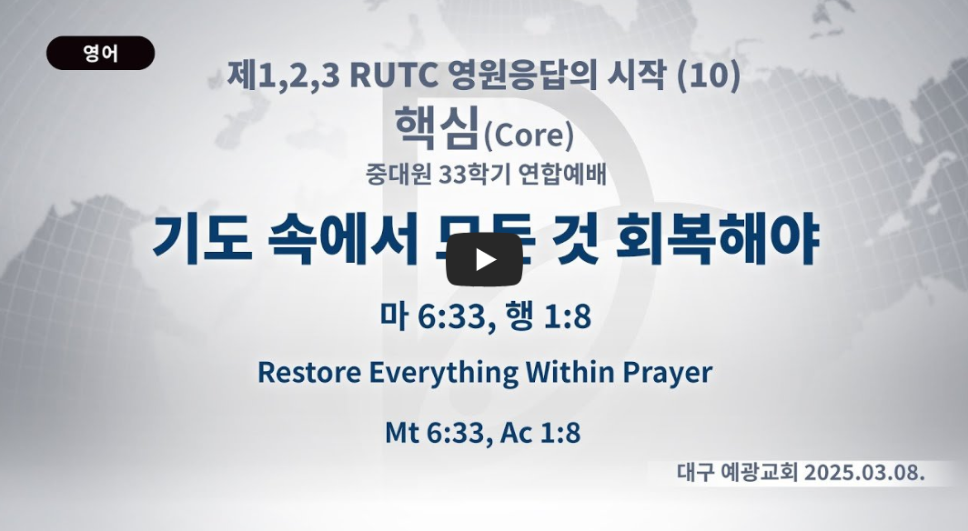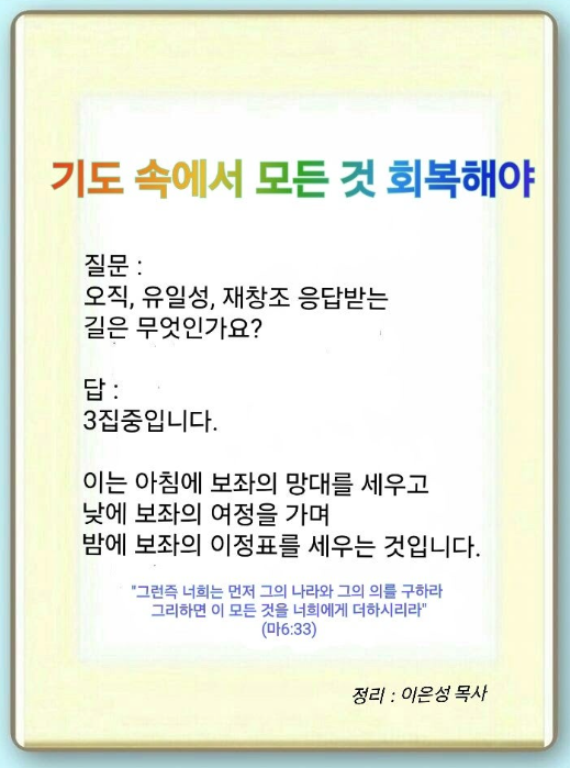 우리는 기도 속에서 모든 것을 회복해야 합니다. 예수께서 “기도 외에 다른 것으로는 이런 종류가 나갈 수 없다.”라고 말씀하셨습니다. 많은 불신자, 새신자가 고통 속에 있습니다. 이 고통이 해결되지 않아 자꾸 몸부림침으로 전 세계에는 네피림 산업이 일어나고 있습니다. 그래서 우리는 그리스도께서 주신 구원과 응답으로 승리해야 합니다. 보좌의 망대와 여정, 이정표를 세우면, 우리의 업은 300% 응답을 받게 됩니다. 이 기도를 계속하게 되면 응답이 오직으로 오게 되고, 다른 사람이 이 응답을 보게 되는 유일성이 옵니다. 이때부터 아무도 모르는 것을 하게 됩니다.(재창조) 그렇다면 우리가 어떻게 하면 이 응답을 받게 될까요?