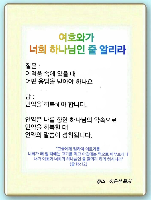 하나님은 우리를 부르실 때 이미 모든 것을 준비하셨고, 약속하셨습니다. “내 민족을 내보내어 피 제사 드리고”,(출 3:7-20) “가나안 땅을 너와 네 후손에게 영원히 주었나니”,(수 1:3, 창 13:14-18) “네 손에 든 지팡이를 가지고 바로 왕 앞에 가라.”(출 4:1-23) 그러나 우리가 불신앙과 원망에 빠지면 영안은 어두워지고 육안만 밝아집니다. 하나님은 약속하신 말씀을 반드시 성취하십니다. 그래서 어려움을 당할수록 그 약속을 회복해야 합니다.