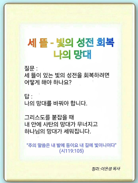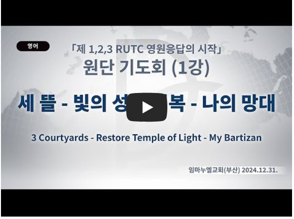 강대국과 이스라엘, 우리나라 정치가들과 여론에 사탄이 역사하여 어둠에 빠지게 되었습니다. 이때 빛의 세력인 선교사들이 와서 창조의 빛으로 어둠을 이기고,(창 1:3) 해방의 빛이 임했습니다.(사 60:1-2) 주의 말씀은 발에 빛입니다.(시 119:105) 예수께서 빛으로 오셨고,(요 1:11) 우리는 세상의 빛입니다.(마 5:14) 우리가 첫 번째로 붙잡아야 할 언약은 세 뜰이 있는 빛의 성전 회복입니다. 이를 위해 나의 망대를 바꾸고, 남은 자, 남는 자, 남을 자, 남길 자의 기도가 시작되어야 합니다. 24 기도하면 25가 보이고, 영원한 작품이 나옵니다. 이러면 세 가지 뜰을 이루는 엄청난 말씀 성취가 일어납니다.(요 1:14) 다민족 선교사들이 우리나라에 와서 학교와 병원을 세우고 복음을 전파했습니다. 이처럼 세 가지 뜰의 언약 잡은 우리를 통해 다민족이 살아날 것입니다.