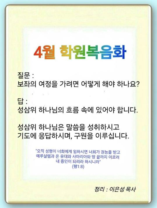 사도행전 1:8 / 오직 성령이 너희에게 임하시면 너희가 권능을 받고 예루살렘과 온 유대와 사마리아와 땅 끝까지 이르러 내 증인이 되리라 하시니라