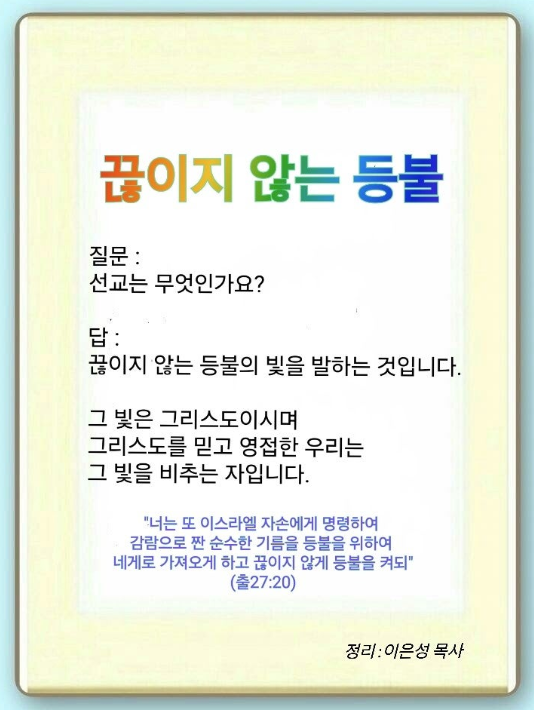 선교는 끊이지 않는 등불의 빛을 발하는 것입니다. 영원한 흑암에 빠지면 자손 대대로 어려움을 겪게 됩니다. 여기에서 우리를 건지신 것입니다. 광야 길은 언제 어디서 어려움이 닥치거나 적이 쳐들어올지 알 수 없습니다. 굉장한 절망이 올 수도 있습니다. 그리스도께서 빛으로 오셨습니다. 그래서 그분을 영접할 때 이 빛이 비칩니다.(요 1:11-12) 예수께서는 우리를 빛이라고 하셨습니다.(마 5:13-16) 이 신분을 믿을 때 역사가 일어나고, 이 빛을 전달할 때와(벧전 2:9) 기도할 때 역사가 일어납니다. 성경에서는 이 빛을 어떻게 말하고 있을까요?