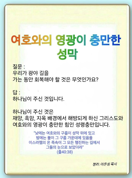 우리는 광야 길을 가는 동안 하나님이 주신 것을 회복해야 합니다. 그것이 여호와의 영광이 충만한 힘입니다. 우리에게는 아무도 가르쳐주지 않은 문제가 있습니다. 이유도 모르고 닥친 재앙, 흑암, 지옥 문제입니다. 그래서 하나님이 아무도 설명하지 못하는 빛을 주셨습니다. 이 빛으로 재앙과 흑암, 지옥 배경에서 해방되었습니다. 또한 하나님 자녀의 신분과 흑암 이길 권세까지 주셨습니다. 그래서 우리는 여호와의 영광이 충만할 이유를 후대에게 증거 해야 합니다. 아브라함에게 약속하신 것이 요셉을 통해 성취되었습니다.(창 41:1-38) 모세를 통해 일어난 10기적이 애굽의 모든 흑암을 꺾었습니다.(출 5:1-12:46) 사무엘의 미스바운동,(삼상 7:1-15) 다윗의 1천 망대와 성전 준비,(아 4:1-5) 다니엘, 세 청년, 에스더를 통해 일어난 증거,(사 60:1) 이 모든 것이 여호와의 영광이 충만하여 일어난 것입니다. 그리스도께서 행 1:1, 3, 8을 직접 설명하셨습니다. 이것을 바울이 다시 후대에게 전달했습니다.(행 17:1, 18:4, 19:8) 여호와의 영광의 내용은 무엇일까요?