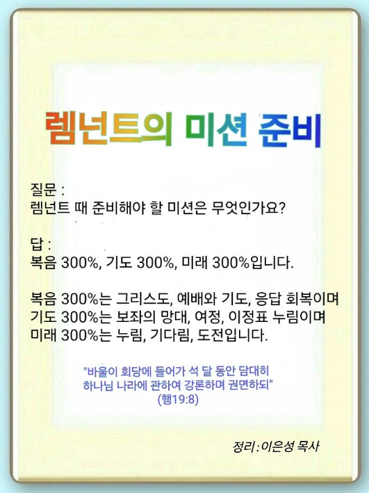 복음 300%를 회복해야 합니다. 복음 회복은 언약으로 하는 것입니다. 이 언약은 믿음으로 회복하는 것입니다. 하나님은 믿는 순간 ‘의’로 여긴다고 하셨습니다. 믿음은 보이지 않습니다. 그러나 성경에서는 믿음은 바라는 것들의 실상이요, 보지 못하는 것들의 증거라고 하셨습니다. 그래서 믿음으로 언약을 붙잡으면 됩니다. 애굽 시대에 하나님은 모세에게 모세오경을 주셨습니다. 모세오경은 인간의 문제와 답을 설명한 창세기, 출 흑암한 출애굽기, 예배를 설명한 레위기, 12지파와 12지역을 설명하는 민수기, 각인, 뿌리, 체질의 이유를 알린 신명기를 말합니다. 여기에서 설명한 언약을 믿으면 됩니다. 왕정시대 때 다윗은 1천 망대와 세 가지 뜰이 있는 성전을 준비했습니다. 렘넌트들은 다윗처럼 1천 망대 세울 능력을 키워야 합니다. 그리고 유랑민 시대에 주신 그리스도,(행 17:1) 예배와 기도,(행 18:4) 응답을(행 19:8) 회복해야 합니다.