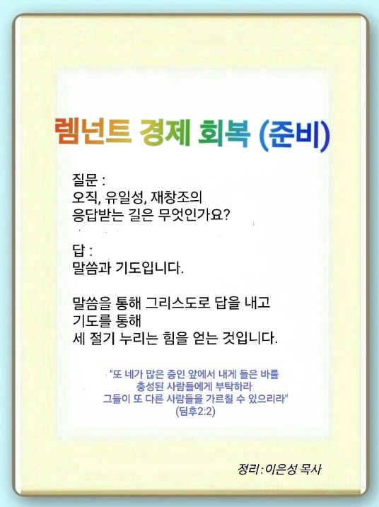 렘넌트는 렘넌트 경제를 회복하는 준비를 금토일 시대에서 해야 합니다. 먼저 힘이 되는 책을 읽고 말씀으로 답을 내야 합니다. 반드시 위인을 공부하되 그리스도로 답을 내야 합니다. 각 나라의 역사 중에서 가장 중요한 것은 절기입니다. 이것을 공부하면서 세 절기를(구원·능력·배경) 항상 누려야 합니다. 기도를 제대로 배워야 세계를 움직이는 힘이 생깁니다. 이때, 오직이 나옵니다. 이것이 달란트입니다. 이것을 가지고 300% 미래를 준비해야 합니다. 그러면 전문성이 나옵니다. 이것이 유일성입니다. 이것은 반드시 세계화되어야 합니다. 이것이 재창조입니다. 렘넌트가 반드시 알아야 할 것이 있습니다.