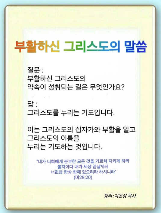 부활은 본디오 빌라도라는 인물과 예수님의 부활을 증명하는 유대인의 자료를 통해(도난설, 환상설, 기절설) 역사적으로 증거되었습니다. 모든 과학자가 지구 종말을 말하고 있습니다. 이후에 모든 사람은 부활하게 됩니다. 그리스도께서 성경대로 부활의 첫 열매가 되셨습니다.(고전 15:3-4, 20) 마 28:18-20, 막 16:15-20, 행 1:8은 부활 메시지입니다. 이것이 망대, 여정, 이정표가 되어야 합니다.