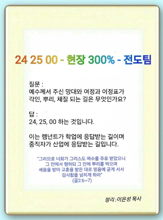 이렇게 하면 렘넌트 7명처럼 응답받게 됩니다. 24, 25, 00 속에서 학업을 찾고, 남은 자, 순례자, 정복자의 축복 속에서 산업을 찾게 됩니다. 우리 사명은 받은 축복을 누리고 응답부터 받는 것입니다. 만나는 사람과 교회를 치유해야 합니다. 그러면 반드시 부흥됩니다. 반드시 참고할 것은 생각을 제대로 해야 한다는 것입니다. 문제에 속지 말고 절대 언약을 찾아야 됩니다.