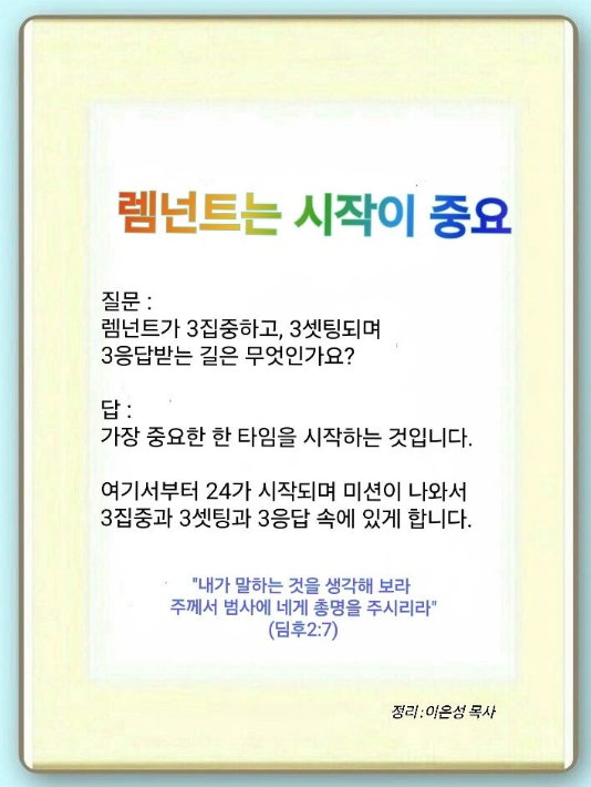 렘넌트들이 3집중을 바로 하기는 힘들 수 있습니다. 가장 중요한 한 타임만 시작하면 됩니다. 그러면 망대가 세워지고 여정과 이정표가 보이게 됩니다. 이때부터는 24가 되고, 내가 무엇을 해야 할지가 나옵니다.