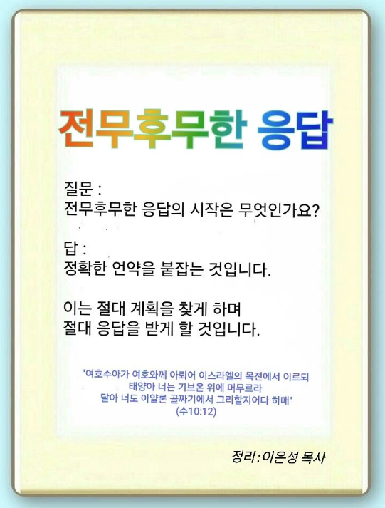 전무후무의 시작은 정확한 언약을 가지고, 절대 불가능에 도전하는 것입니다. 아모리 왕들이 이스라엘을 치러 왔을 때였습니다. 하나님은 그들을 다 네 손에 붙였고, 한 사람도 너를 당할 자 없게 하겠다고 여호수아에게 말씀하셨습니다.(수 10:8) 그런 후 우박을 내려 적군을 막으셨습니다.(수 10:11) 우리가 극한 상황을 만날지라도 정확한 언약을 붙잡는다면 절대 불가능을 이길 수 있습니다.