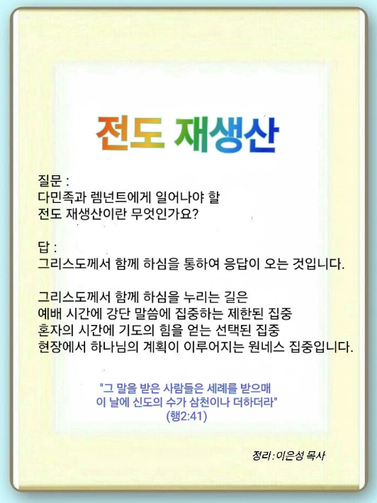 다민족과 렘넌트에게 전도 재생산이 일어나야 합니다. 그리스도와 함께라면 응답부터 옵니다. 이것을 누리게 해야 합니다. 예수께서는 성령을 약속하셨습니다.(요 14:16, 26, 16:13) 제자들에게는 먼저 힘을 얻으라고 하셨습니다. 그리고 성령의 권능과 땅끝까지 증인이 될 것을 약속하셨습니다. 이 언약을 잡고 기도한 제자들에게 시간표 5가지와 문 5가지를 열어주셨고, 기적같은 능력을 나타내셨습니다.(행 1:8, 2:1-47) 바울이 이것을 동일하게 누렸습니다.(행 13:1-4, 16:6-10, 19:1-8) 제자들에게 꿈을 꾸고, 환상을 보며 예언할 것을 약속하셨습니다.(행 2:17-18) 바울이 이 언약을 잡았는데 모든 것에서 전환점이 일어났습니다. 가기도 전에 답을 가지고 갔습니다. 그러면 갈급한 영혼들이 곳곳에 준비되어 있다가 몰려오게 됩니다. 어떻게 전도하면 300%가 가능한지 봐야 합니다. 다른 것에 신경 쓰지 않는 제한적 집중, 예수께서 하라고 한 것을 하는 선택적 집중, 모든 것을 통해서 하나님의 계획을 이루시는 원니스 집중을 하면 300%가 가능합니다.
