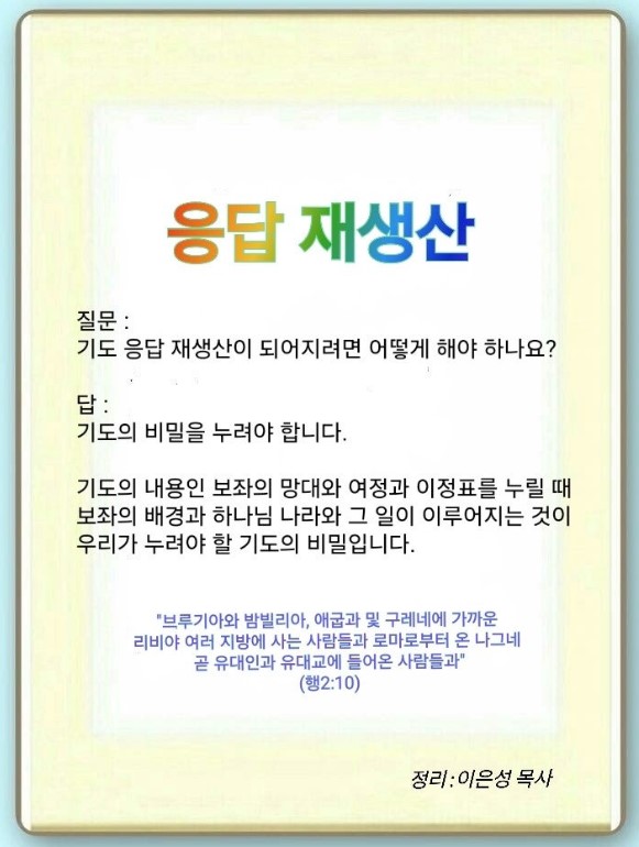 전도 재생산이 가능한 사람은 계속 응답을 받는 사람입니다. 기도 응답 재생산이(기도 300%) 가능하려면 기도를 알아야 합니다. 기도의 내용은 보좌의 배경과 하나님 나라, 하나님 나라의 일이 이루어지는 것입니다. 기도할 때 참고할 것이 있습니다. 예수께서 먼저 유대인 사상과 로마 사상을 버리라고 하셨습니다. 그리고 감람산에서 기도를 바꾸라고 하셨습니다. 사탄의 숨은 망대를 고치라고도 하셨습니다. 기도를 해야겠다고 마음먹는 순간 시스템이 만들어집니다. 보좌의 망대를 내 안에 세우고, 그 힘으로 여정을 가야 합니다. 그러면 부흥의 이정표가 세워집니다. 이를 알았던 바울과 브리스가 부부를 통해 진짜 생명운동이 일어났습니다.