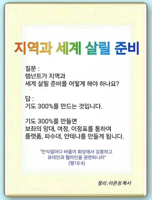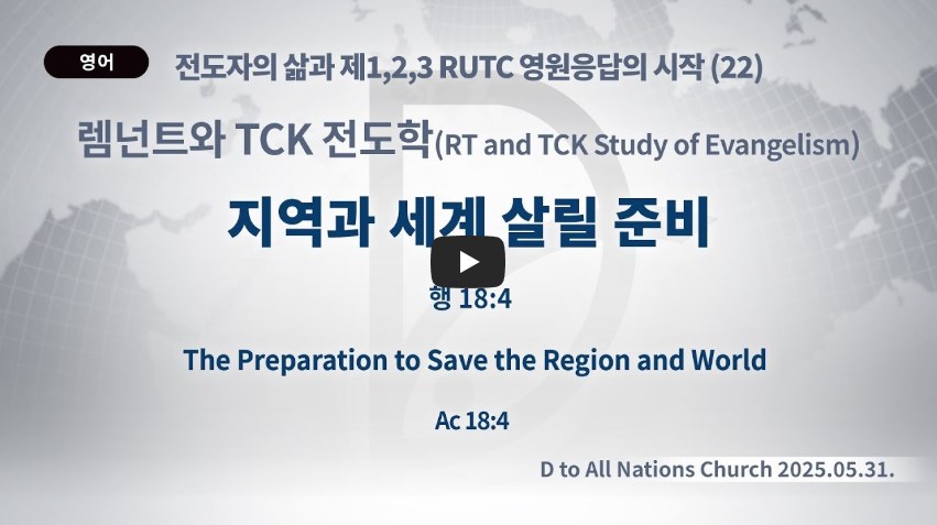 렘넌트는 지역과 세계 살릴 준비를 해야 합니다. 가장 중요한 것은 속지 않고 기도 300%를 만드는 것입니다. 렘넌트는 자기 안에 여호와의 망대를 세워야 합니다.(플랫폼) 그러면 여정을 가면서 빛을 비출 수 있고,(파수 망대) 빛을 발하는 이정표를 만들 수 있습니다.(안테나) 이때부터 학업이 237나라와 5000종족, TCK와 맞게 됩니다. 그러면 하나님께서 시공간 초월과 전무후무한 응답을 주십니다. 보좌의 축복과 하나님 나라가 임하며, 하나님 나라의 일이 이루어지게 됩니다. 그 결과로 응답이 오는 것입니다. 이것을 깨달은 바울은 회당에 들어가 담대히 하나님 나라에 관하여 강론했습니다.(행 19:8)