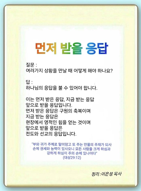 우리가 어려움과 응답, 여러 상황을 만났을 때 어떻게 해야 할까요? 먼저 받을 응답과 지금 받을 응답, 영원한 응답을 항상 봐야 합니다. 다윗이 먼저 받은 응답이 있습니다. 다윗은 보좌의 망대로 플랫폼을 만들었고, 보좌의 능력으로 빛을 발하는 파수대를 만들었습니다. 그래서 시공간 초월의 기도를 누리는 안테나가 되었습니다. 평소에 이것을 누리던 다윗은 가는 곳마다 파수꾼 역할을 했고, 전무후무한 응답을 받았습니다. 많은 사람을 살리고, 기념비를 세워서 많은 발자취를 남겼습니다. 이런 다윗에게 성전 건축의 기도 제목이 왔습니다. 다윗은 과거에 성막, 성전 중심으로 갈 수밖에 없었던 당연, 필연, 절대를 알았습니다. 그렇다면 지금 우리가 받아야 할 응답 세 가지가 무엇일까요?