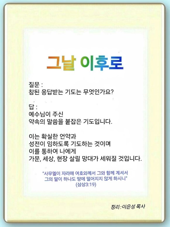 예수께서 주신 약속의 말씀을 붙잡고 기도해야 합니다.(마 4:19, 11:28, 28:18, 20, 막 3:13-15, 16:19-20, 행 1:3) 나에게 가문과 세상, 현장 살릴 망대를 주시고, 확실한 언약과 성전이 임하게 해 달라고 기도하면 됩니다.