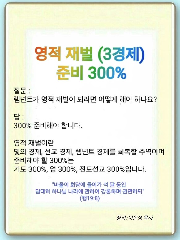 3경제의 여정을 가는데 가장 먼저 있어야 하는 것이 기도 300%입니다. 보좌의 망대, 여정, 이정표를 가는 기도를 시작하는 것입니다. 그다음에 렘넌트는 달란트를 전문성 100%, 현장성 100%, 시스템 100%로 만들어 업 300%를 만들어야 합니다. 이 업은 237-5000종족과 맞아야 합니다. 그러려면 전도와 선교에 대한 300%가 준비되어 있어야 합니다.