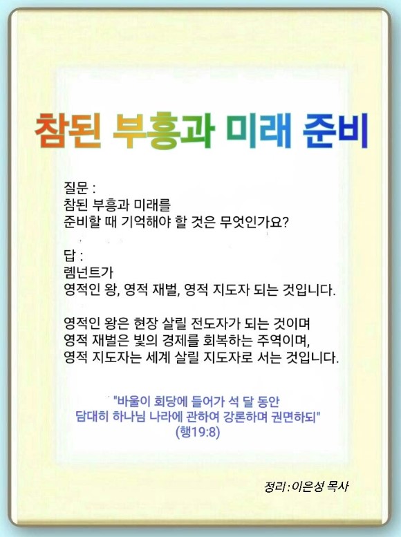 참된 부흥과 미래를 준비할 때 몇 가지 기억할 것이 있습니다. 렘넌트는 영적인 왕으로 현장으로 갔고, 빛의 경제를 회복하는 영적 재벌이었습니다. 모두 세계 지도자로 섰습니다. 그리스도의 당위성과 필연성, 절대성을 알았기 때문에 가능했습니다. 렘넌트는 300%를 준비하고 나가야 됩니다. 렘넌트에게 이미 7망대, 7여정, 7이정표가 주어졌습니다. 7망대는 나의 기도 300%이고, 7여정은 현장에 가서 봐야 하는 300%입니다. 7이정표는 후대를 위해서 정확한 이정표를 세우는 것입니다. 이것이 미래 시스템 300%입니다.