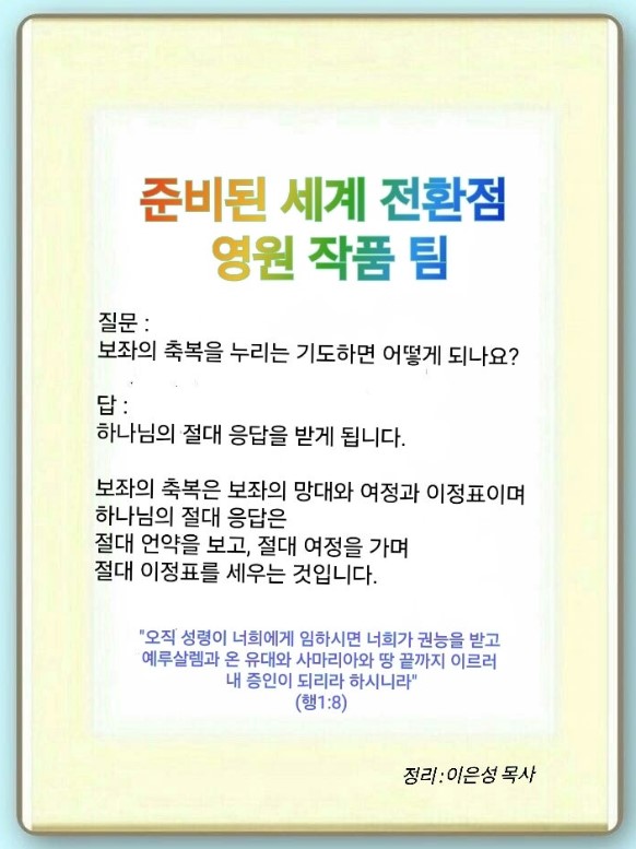 | 준비된 세계 전환점 - 24 선교 제자 (몬테소리 치유센터) (0) | 2026.04.18 |