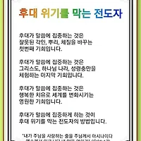 하나님 자녀는 지금도 이루어지는 말씀성취의 역사, 기도응답의 역사, 구원의 역사(3오늘; 오늘의 말씀, 기도, 전도) 속에서 살아갑니다. 이렇게 놀라운 축복 속에서 만난 제자들의 모임은 아주 중요합니다. 이들이 바로 세상의 위기를 막을 자들이기 때문입니다. 이들이 모였을 때 가장 먼저 찾아야 하는 것이 바로 천명, 소명, 사명입니다. 과연 어떻게 찾을 수 있을까요?