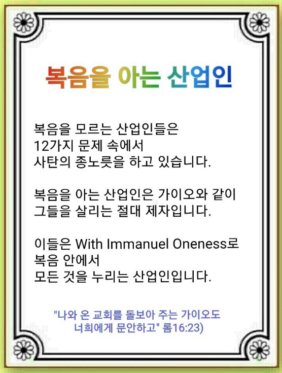 ‘함께’(With)라는 단어는 구원의 축복을 가리킵니다. 이것은 인간의 한계를 뛰어 넘는 비밀입니다. 그리고 임마누엘의 축복은 우리와 함께하시는 하나님을 누리는 비밀입니다. 이 비밀을 가진 사람이 모든 일에서 하나님과 Oneness를 할 수 있습니다. 대부분의 사람이 일과 사람 때문에 시험에 듭니다. 심지어 교회 사역을 하다가도 많은 갈등을 합니다. 그러나 복음 안에서 모든 것을 누리는 산업인은 함께(With), 임마누엘(Immanuel), Oneness의 축복을 누리므로 그 무엇도 문제가 되지 않습니다. 이들에게 문제는 하나님의 더 큰 축복을 체험할 기회입니다.