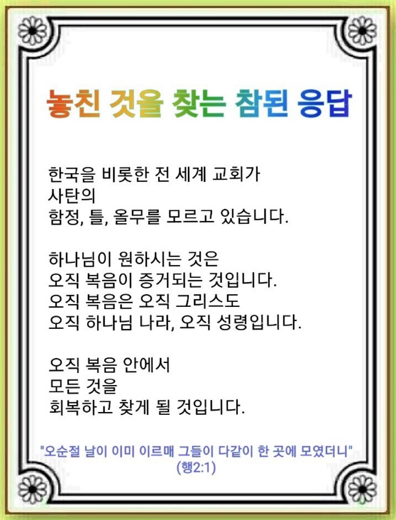오직 복음 안에서 모든 것을 회복하고 찾아야 합니다. 오직 복음 안에는 5가지가 있습니다. 먼저 불 같은 바람 같은 성령의 역사입니다(사도행전 2:1~4). 이후 15개 나라의 문이 열렸고(사도행전 2:9~11), 하나님의 말씀이 성취되었습니다(사도행전 2:14~21). 전도할 수 없는 현장임에도 불구하고 3천 제자가 일어났으며(사도행전 2:41~42), 현장을 살리는 응답이 따라 왔습니다(사도행전 2:43~47).