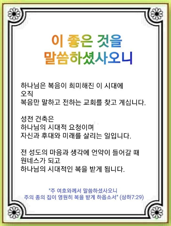 성전 건축은 하나님의 시대적 요청입니다. 어느 날 다윗이 전쟁에 승리하고 돌아왔습니다. 왕궁에 있는 다윗은 천막에 있는 언약궤를 보고 마음이 무거웠습니다. 하나님은 나단 선지자를 통해 다윗에게 성전 건축을 말씀하셨습니다. 다윗은 이 좋은 것을 말씀하신 하나님께 감사하며 소중한 이 일을 이루어가는 종의 집이 복 받기를 기도했습니다(사무엘하 7:18~29). 성전 건축은 자신과 후대와 미래를 살리는 일입니다.