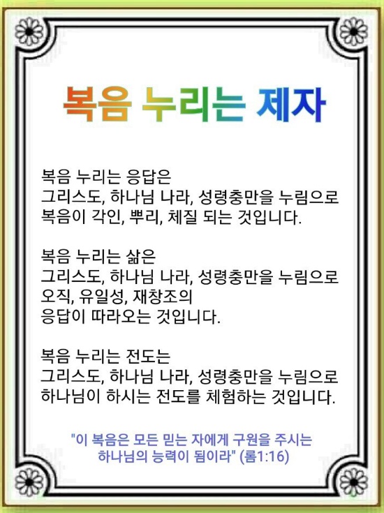 항상 오직 그리스도, 하나님 나라, 성령 충만이라는 안경으로 나와 세상, 문제를 본다면 중요한 것을 찾아 누리게 됩니다. 그리고 복음이 삶에 깊이 뿌리내리고 영향을 주는 것을 체험하게 될 것입니다. 복음 누리는 응답을 통해서는 오직, 유일성, 재창조가 실현되고, 이 복음이 각인, 뿌리, 체질 될 것입니다. 나아가 지속되는 전도도 체험하게 됩니다.
