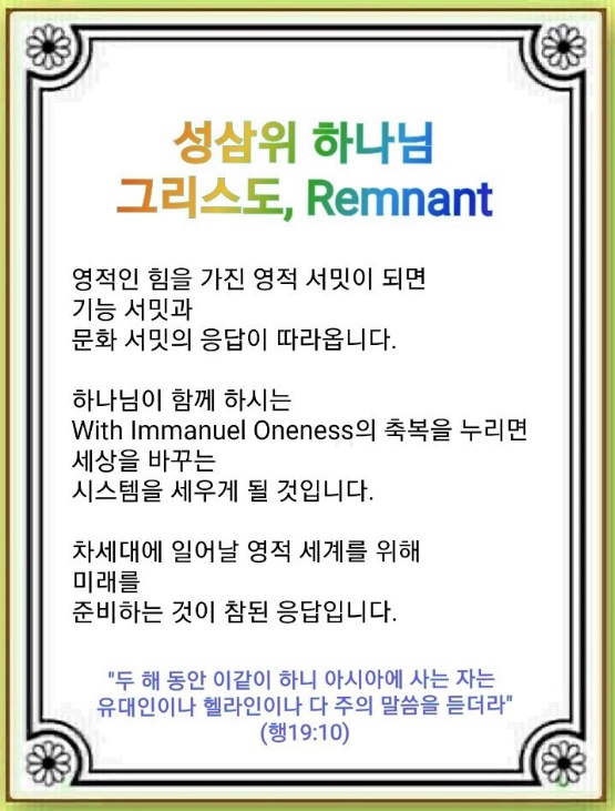 3단체(뉴에이지, 프리메이슨, 유대인 조직)까지 살릴 시스템을 만들어야 합니다. 성경에 기록된 역사는 지금도 계속되고 있습니다. 3단체를 통해 역사하는 흑암 세력이 전 세계를 장악하고 있습니다. 후대들에게 복음 안에서 이들을 능가할 수 있음을 가르쳐야 합니다. 하나님이 항상 나와 함께(WITH)하시며, 그 하나님이 항상 우리와 함께하심(Immanuel) 속에서 Oneness의 축복을 누리면 됩니다. 이 힘을 가질 때, 세상을 바꾸는 시스템을 세우게 될 것입니다.