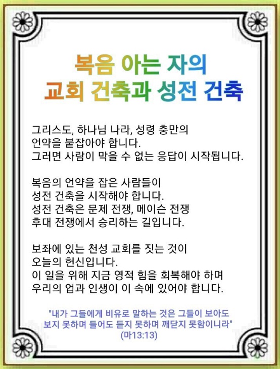 복음의 언약을 잡은 사람들이 성전 건축을 시작하는 것입니다. 물론 성전이 없어도 예배를 드릴 수는 있습니다. 그러나 우리에게는 더 큰 싸움이 남아 있습니다. 불신자들이 만든 문화와 전쟁하는 문화 전쟁, 강대국을 장악한 사탄의 Mason(석공)과 하는 Mason 전쟁, 후대들이 보고 복음을 알도록 만드는 후대 전쟁을 위한 성전을 건축해야 합니다. 마지막으로 237개 나라가 모여 하나님을 경배하고 찬양하는 성전을 건축해야 합니다. 하나님은 우리의 오늘과 모든 인생을 237개 나라를 살리는 일에 사용하실 것입니다.