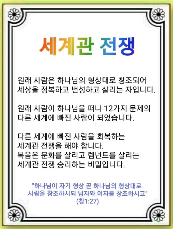 원래 사람이 하나님을 버리고 나, 물질, 성공이라는 세계관에 빠졌습니다(창세기 3:4~5, 6:4~5, 11:1~8). 눈에 보이든 안 보이든 전 세계가 무속과 점술과 우상으로 덮였습니다(사도행전 13:5~12, 16:16~18, 19:8~20). 이러다보니 자신도 모르게 하나님이 아닌 다른 주인을 섬기고 다른 삶을 살게 되었습니다(요한복음 8:44). 그리고 이들이 7가지 현장(복지, NGO, 문화, 미자립, 다민족, 탈북자와 난민, 치유)과 이념, 정치, 종교, 경제, 문화 속으로 침투했습니다.