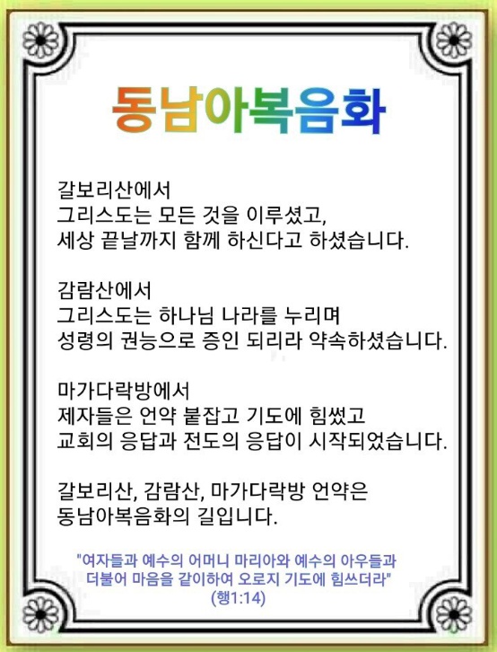 예수님이 갈보리산에서 모든 것을 이루셨습니다. 하늘과 땅의 모든 권세를 가지신 예수님이 세상 끝날까지 우리와 함께하시겠다고 하셨습니다(마태복음 28:16~20). 이것을 본 의사 누가는 누가복음에서 예수가 그리스도이심을 증거했습니다(사도행전 1:1). 복음은 곧 예수가 그리스도라는 기쁜 소식입니다. 이것을 전하는 것이 전도입니다. 이 복음을 누리는 전도팀을 통해 하나님은 동남아를 살리실 것입니다.