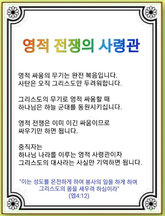 싸우기만 하면 됩니다. 영적 전쟁은 이미 이긴 싸움입니다. 하나님은 중직자를 그리스도의 대사로 보내셨기 때문에 영적 전쟁에서 이길 수밖에 없기 때문입니다. 가나안 정복은 이미 약속된 하나님의 언약이었습니다. 갈멜산 전투 역시 이미 이긴 싸움이었습니다. 로마 정복도 마찬가지입니다. 그러므로 중직자는 하나님 나라를 이루는 영적 사령관이자 그리스도의 대사라는 사실만 기억하면 됩니다.