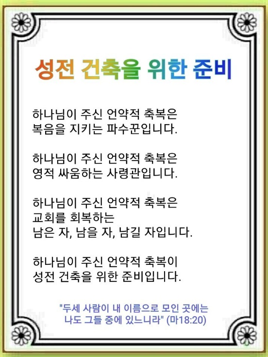 성전 건축을 하면서 다윗에게 주신 하나님의 언약과 축복을 회복해야 합니다. 그리고 우리 인생을 회복해야 합니다. Mason 전쟁이 시작되었기 때문입니다. 흑암이 큰 신전을 만들어 사람들에게 어둠의 영향력을 끼치고 있습니다. 3단체(뉴에이지, 프리메이슨, 유대인 조직)는 흑암문화를 만들어 내고 있습니다. 또 굉장한 우상을 만들어 경제를 장악했습니다. 이런 시대에 우리는 올바른 교회, 올바른 하나님 자녀의 축복을 회복해야 합니다. 그렇다면 하나님은 우리에게 어떤 축복을 준비하셨을까요?