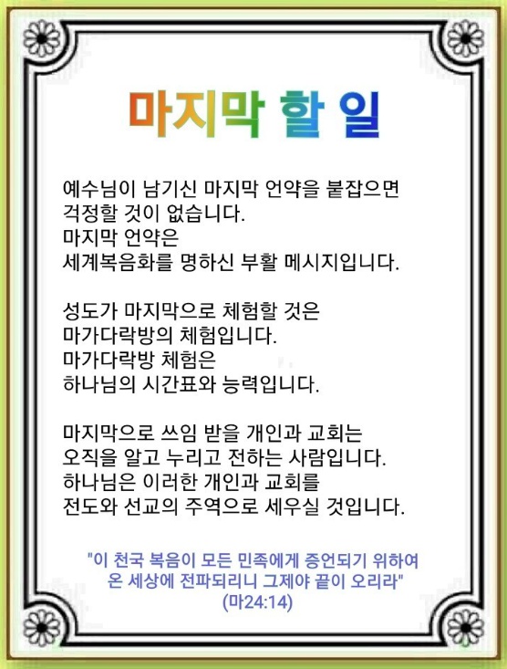 성도가 마지막으로 체험할 것은 마가다락방의 체험입니다. 마가다락방은 지구상 최고 응답의 장소입니다. 이 체험 이후 5가지 하나님의 시간표가 임했습니다. 그 누구도 할 수 없는 능력이 나타난 것입니다(사도행전 2:1~47). 이것을 체험한 성도들은 어려움이 와도 괜찮았습니다. 스데반의 환난 이후에는 안디옥 교회가 세워지는 응답이 있었습니다(사도행전 11:19~30). 마침내 이 언약을 잡은 사람들이 로마를 살렸습니다.