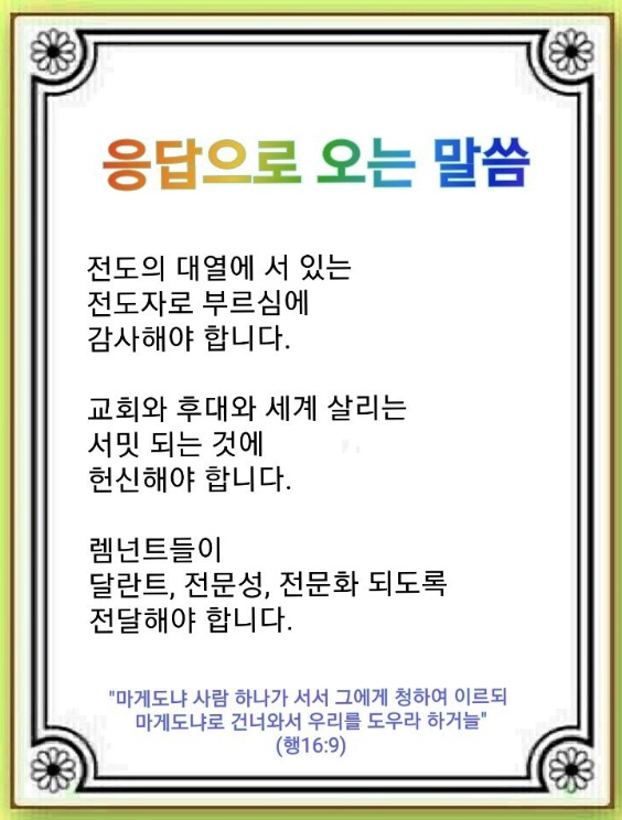 이 축복을 Remnant에게 전달하면 됩니다. 하나님이 Remnant 각자에게 주신 달란트를 발견하게 만들고(성인식), 세상을 살릴 전문성을 찾아내며(사명식), 세상을 살릴 힘을 갖추게 해서 내보내는(파송식) 것입니다. 그리고 차세대에게 언약을 전달하는 것이 우리의 사명입니다. 다른 방법이 아닌 하나님이 주시는 말씀 성취를 따라간다면, 강대국을 살린 Remnant들과 현장에서 시대와 싸운 히브리서 11장의 인물들, 말씀 성취의 완성을 누린 초대교회 성도와 같은 응답을 받게 될 것입니다.