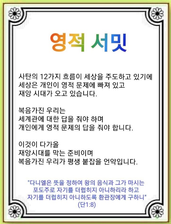 전 세계로 나가서 세계관에 대한 답을 주어야만 합니다. 12가지 문제(창세기 3, 6, 11장, 사도행전 13, 16, 19장, 불신자 상태 6가지)가 문화, 정치, 경제, 사회에 파고들어 흐름을 만들고 있기 때문입니다. 특히 지금 세상을 움직이는 엘리트는 가장 큰 피해를 입었습니다. 누가 뭐라고 해도 사탄의 12가지 흐름이 세상을 주도하고 있습니다. 복음가진 우리만 세상에 답을 줄 수 있습니다. 이것이 바로 우리의 사명입니다.