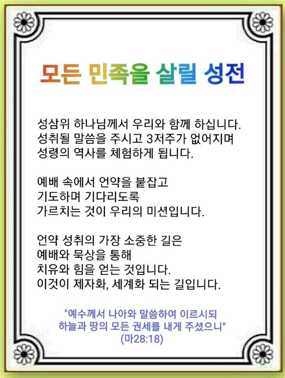 모든 민족을 제자로 삼는 세계복음화를 말씀하셨습니다. 이것을 위해 하나님은 우리에게 세계화의 능력을 예비하셨습니다. 이 능력을 누릴 때 제자가 되고 제자를 삼을 축복이 임하게 됩니다. 나아가 만남을 주셔서 후대와 제자를 가르쳐 지키게 할 흐름이 만들어집니다. 이 언약 성취의 가장 소중한 길은 예배와 깊은 기도, 묵상을 통해 깊은 치유와 힘을 얻는 것입니다. 이것을 항상 기억해야 합니다.