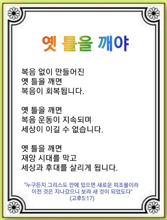모든 사람에게 있는 과거의 문제가 오늘의 발판으로 실현되는 응답을 받을 수 있습니다. 무너진 시대마다 복음의 새 틀을 회복할 때 기적이 일어났습니다. 옛 틀을 완전히 벗어나지 못하면 재앙이 반복됩니다. 이때 이 틀을 깬 소수의 사람을 통해 복음이 회복되고 지속되었습니다. 하나님은 이 시대의 옛 틀을 깨는 응답을 위해 우리를 부르셨습니다.