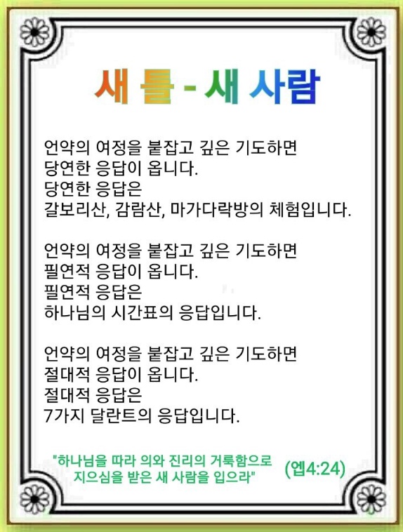 새 틀을 갖춘다는 것은 새 사람이 되는 것을 뜻합니다. 사람마다 언약의 여정(CVDIP)은 다를 수 있습니다. 이때 가장 중요한 것은 언약(Covenant)을 반드시 붙잡고 하나님이 주신 비전(Vision)을 꿈(Dream)꾸는 것입니다. 이것은 하나님의 말씀과 기도로만 성취됩니다(Image). 그러면 작은 실천이 큰 작품을 만듭니다(Practice). Remnant는 이것을 가지고 5분이라도 깊은 기도의 시간 동안 깊은 호흡과 작은 실천을 하면 놀라운 응답을 누리게 됩니다. 어떤 응답일까요?