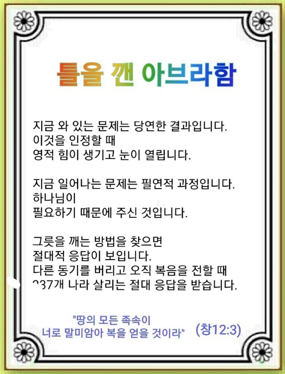 아브라함이 고향과 친척과 아버지의 집을 떠나오며 엄청난 틀을 깼습니다. 그런데 하나님의 언약을 붙잡고 나온 아브라함에게 고통이 계속 되었습니다. 아브라함이 불신앙의 틀을 깨지 못했기 때문입니다. 그럼에도 하나님은 아브라함을 성공시키셨습니다. 우리에게도 그가 받은 응답이 준비되어 있습니다. 아브라함에게 주신 응답을 받기 위해서 우리는 무엇을 붙잡아야 할까요?