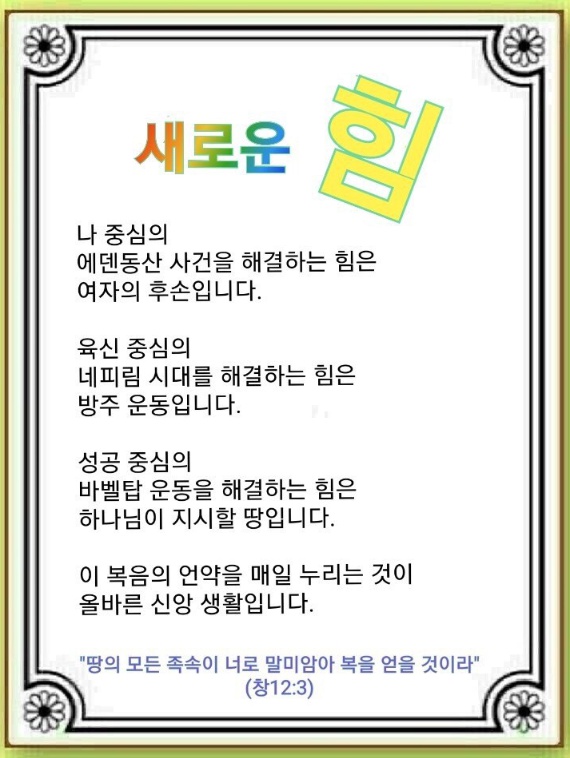 하나님이 아브라함에게 “너를 축복하는 자에게는 내가 복을 내리고 너를 저주하는 자에게는 내가 저주하겠다”라고 말씀하셨습니다. 하나님은 우리에게도 이 새로운 힘을 주실 것을 약속하셨습니다. 이 힘은 세상에서 누구도 가르쳐주지 않습니다. 심지어 신학교나 교회에서도 체험할 수 없는 힘입니다. 그래서 많은 성도가 이 힘을 알지 못하고 세상의 종노릇을 하고 있습니다. 영적 문제는 당연히 심각해질 수밖에 없습니다. 이 틀을 깨고 새 틀을 준비하기 위해 알아야 할 언약이 있습니다. 무엇일까요?