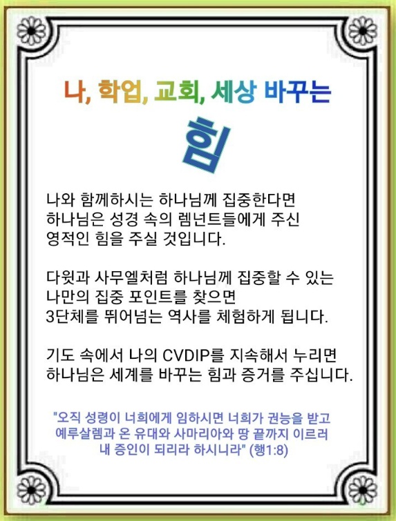 하나님이 주신 최고의 비밀인 기도 속에서 나의 CVDIP를 실제로 찾고 지속해서 누려야 합니다. 정시기도 속에서 하나님이 주신 CVDIP로 최고의 힘을 얻고, 무시기도를 통해 현장에서 하나님의 응답을 확인할 수 있습니다. 집중기도는 하나님의 역사를 체험하는 길이 됩니다. 오늘 나와 함께하시는 하나님께 집중하는 비밀을 기도로 누릴 때, 하나님은 세계를 바꾸는 힘과 증거를 허락하실 것입니다.