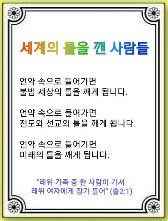 언약 속으로 들어가면 싸울 필요도 없이 증거가 따라옵니다. 하나님의 백성인 이스라엘이 우상 신전을 만드는 일을 하는 노예가 되었습니다. 이스라엘 백성이 번성하자 바로 왕은 남자 아이가 태어나면 무조건 죽이라고 명령했습니다. 이때 모세가 태어났습니다. 요게벳은 불법 세상의 틀을 깨는 언약 속으로 들어갔습니다. 막강한 힘을 가진 세상 왕이 만든 법을 완전히 깨뜨렸습니다.