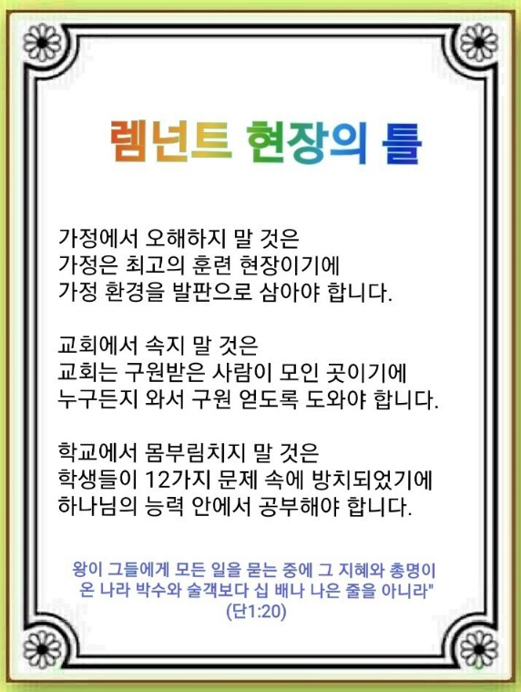 많은 사람이 생존을 위한 경쟁에 몸부림치고 발악하고 있습니다. 학교 현장도 마찬가지입니다. 많은 학생이 12가지 문제(창세기 3, 6, 11장, 사도행전 13, 16, 19장)의 흐름 속에 방치된 채 오직 공부에만 몰입하고 있습니다. Remnant는 다니엘과 세 친구처럼 하나님의 능력 안에서 공부하는 비밀을 체험해야 합니다. 기도하면서 공부하고, 공부하면서 기도하며 서밋으로 세워질 현장으로 나갈 준비를 하면 됩니다. 그 기회가 학교 현장과 그 시간표 속에 준비되어 있습니다.