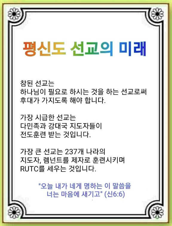 지금은 가장 큰 영적 전쟁의 시대입니다. 사탄은 우상 신전을 만들어 사람들을 현혹시키고 있습니다. 그러므로 우리는 몇 가지 준비를 해야 합니다. 우선 237개 나라의 지도자를 초정해야 합니다. 그리고 237개 나라의 Remnant를 불러야 합니다. 나아가 237개 나라에 RUTC를 세워야 합니다. 이를 통해 복음, 전도, 기도 훈련을 시킴으로 전 세계를 살릴 수 있습니다.