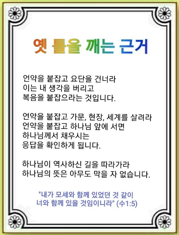 하나님은 가나안 땅을 앞에 두고 여호수아를 지도자로 세우셨습니다. 그리고 그에게 9번이나 “담대하라, 강하라, 두려워하지 말라”라고 말씀하셨습니다. 이처럼 하나님은 하나님의 사람과 영으로 함께하시고 도우시며 힘을 주십니다. 하늘 보좌의 축복으로 주의 사자들을 보내셔서 응답하시고, 하나님의 사람이 가는 곳에는 흑암 세력이 도망가게 되어 있습니다. 이것이 옛 틀을 깨는 근거입니다. 하나님이 여호수아에게 옛 틀을 깨는 말씀을 주셨습니다. 그 말씀은 무엇일까요?