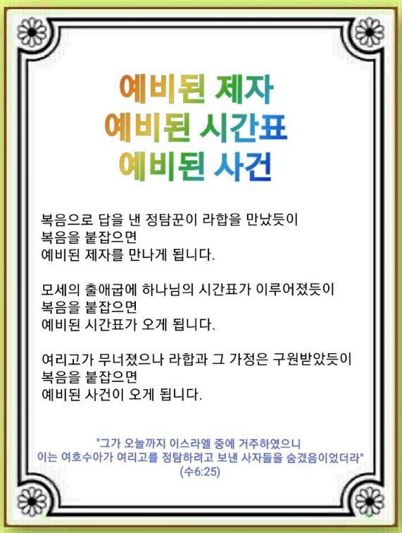 우리가 이 언약을 잡고 24시간 기도하면 예비된 사건을 통해 25시의 축복과 영원한 응답을 누리며 237개 나라를 살리는 응답을 받게 됩니다. 라합이 그 증인입니다. 여리고성 안에 있던 모든 사람은 멸망했습니다. 라합은 이 사실을 미리 알고 언약을 붙잡았습니다. 그 한 사람의 믿음이 모든 가족을 살렸습니다. 이후 라합은 이스라엘 백성이 거주할 땅에 함께 머물게 되었습니다. 마침내 만남의 축복을 통해 그리스도의 족보에 들어가는 축복도 받았습니다.