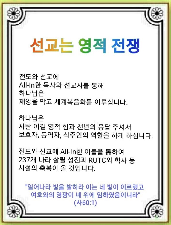 “모든 민족”, “만민”, “땅끝”이라는 약속된 응답을 붙잡고 24시 기도에 All-In해야 합니다. 하나님은 전도와 선교에 All-In한 사람들에게 237개 나라를 살릴 성전을 짓는 응답을 예비하셨기 때문입니다. 또, 237개 나라의 모든 현장에 RUTC와 학사를 세울 축복도 준비하셨습니다. 이것은 욕심이 아닌 하나님의 약속입니다.