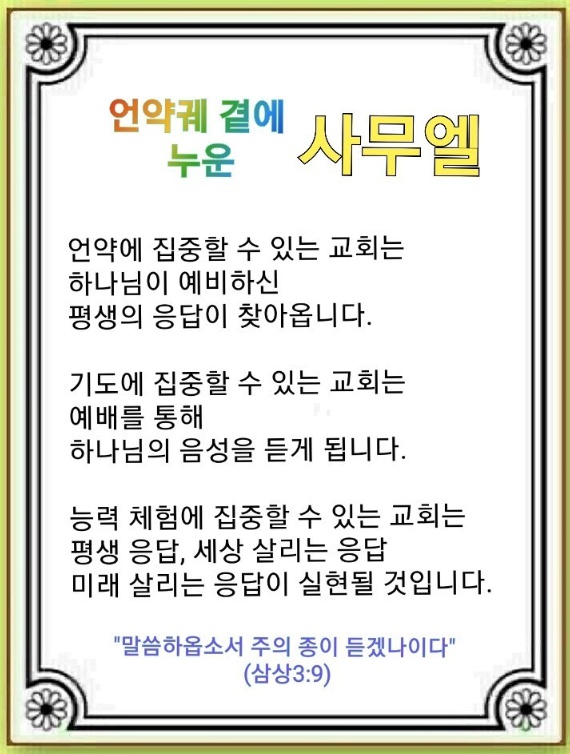 어린 사무엘이 언약궤가 있는 여호와의 전에 눕자 하나님이 그 시간에 사무엘에게 말씀을 주셨습니다. 그 말씀은 성취되었고 이스라엘에 이 사실이 전파되었습니다. 어린 사무엘이 영적 힘을 회복하는 시간을 갖자 놀라운 역사가 일어난 것입니다. 이처럼 어릴 때 각인된 복음과 기도는 시대의 흐름을 바꾸는 능력이 됩니다. 이 모든 응답이 시작될 교회는 어떤 교회일까요?