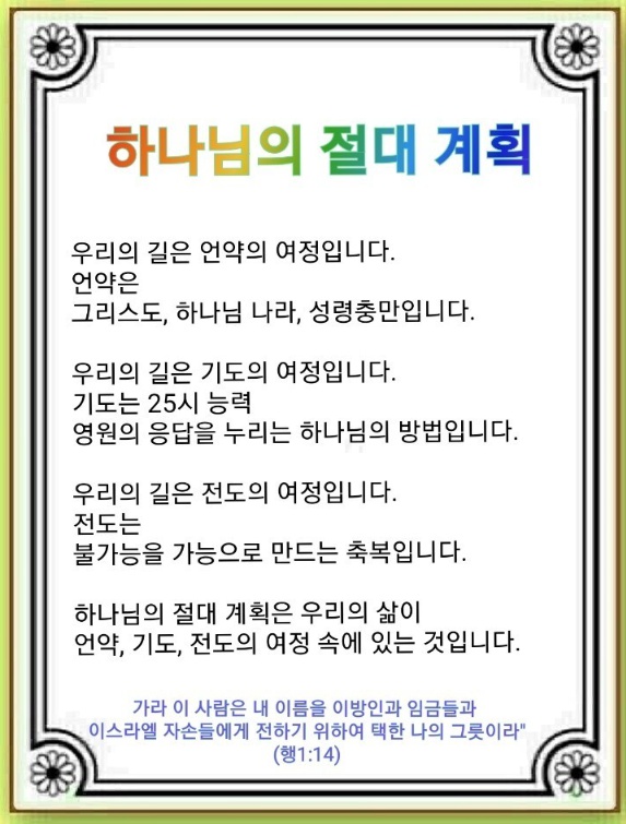 우리의 길은 다른 길이 아닌 언약의 여정입니다. 우리에게 주신 언약은 절대 언약이기 때문에 하나님은 절대 불가능한 상황에서도 절대 가능을 이루십니다. 우리가 붙잡은 절대 언약은 그리스도, 하나님 나라, 성령 충만입니다. 주위에서 들리는 사람의 말을 존중하되 우리의 기준은 하나님의 말씀이라는 사실을 늘 기억해야 합니다. 그리고 하나님이 주신 것에 24시 집중한다면 하나님의 역사를 체험하고 언약 성취의 작품을 남기게 될 것입니다.