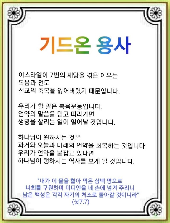 이스라엘은 국가적으로 7번의 재앙을 겪었습니다. 노예가 되기도 했고 전쟁을 통해 언약궤를 빼앗기기도 했습니다. 강대국에 조공을 바치는 속국이 되기도 했습니다. 복음과 전도, 선교의 축복을 잃어버린 이스라엘의 모습은 비참했습니다. 그런데 그때와 같은 일이 지금도 반복되고 있습니다. 복음의 흐름을 놓쳐 교회가 무너지고 있습니다. 복음을 회복할 시급한 복음운동이 필요합니다.